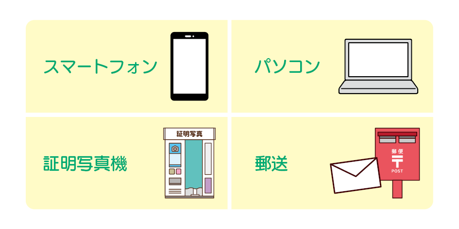❶「オンライン」「証明写真機」「郵送」のいずれかでマイナンバーカードの交付を申請します。